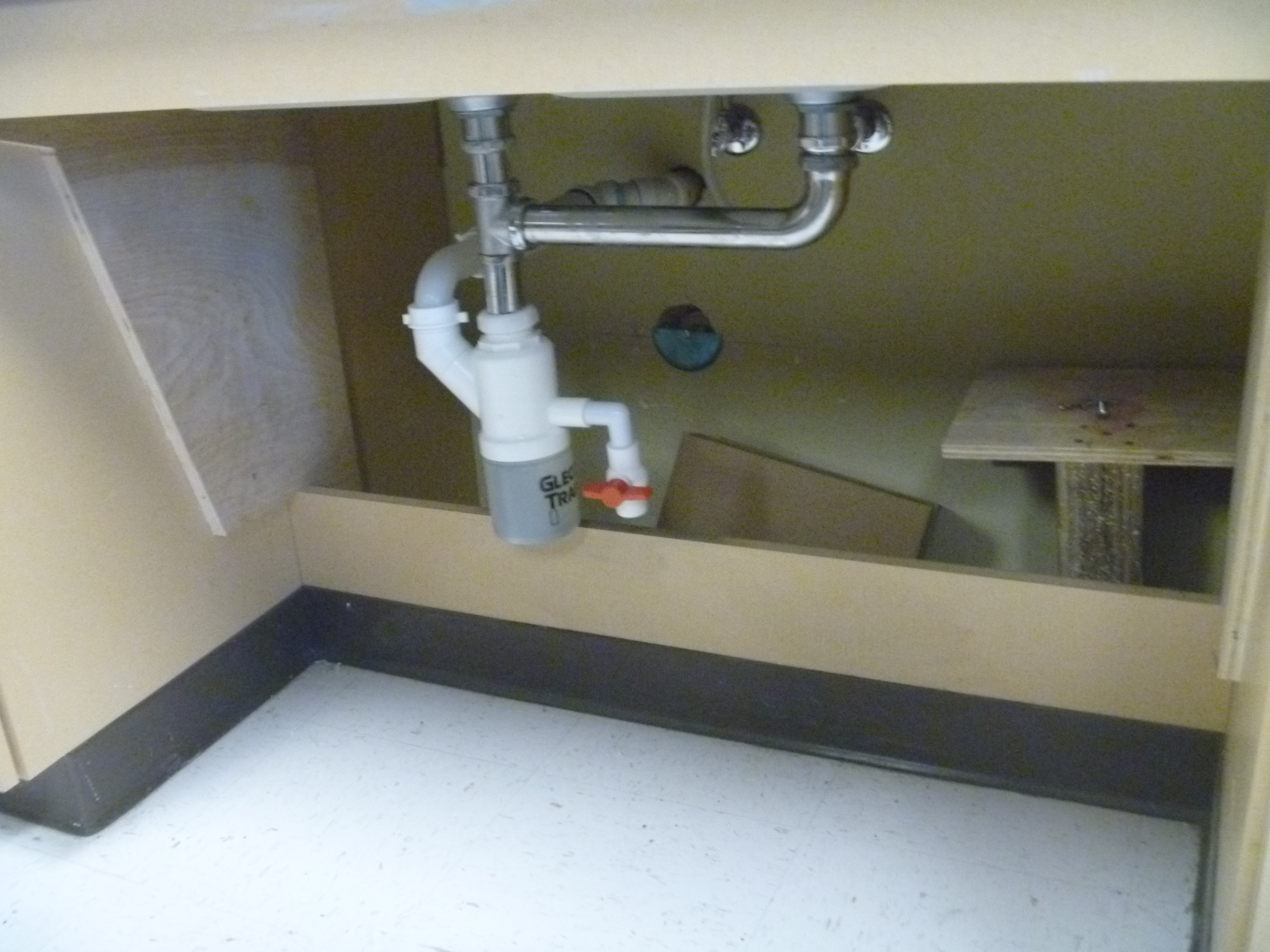 However, he showed up again this morning and picked up where he left off. He finished installing the traps and was on his way. Now, there is one last thing to do because someone in the district doesn’t want the under sink area exposed. I guess the pipes might feel neked.