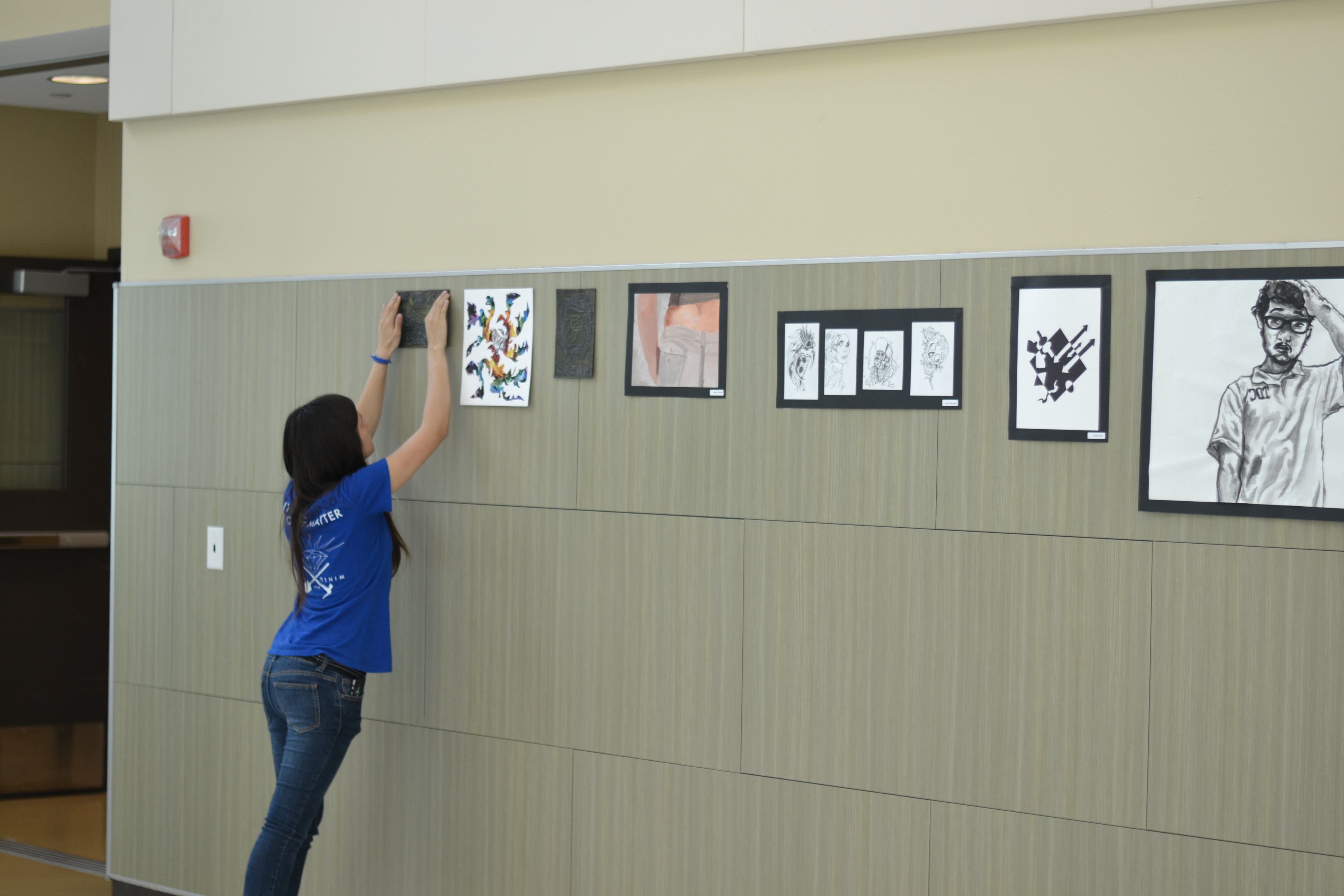 Taylor High School Visual Arts Department proudly presents the inaugural Art Show. March 28, 2014 at 7pm the doors opened and the show began. That morning I arrived at school at my normal time of 8am. Then the madness began. I gathered up my thoughts and set up camp in the front of the school outside the main office. Students came to help at various points in the day, and several students “skipped” their classes and helped all day. And, for that I am grateful. They gladly hung work and dealt with me and my blabbering and my orders and my annoyances and all the rest.