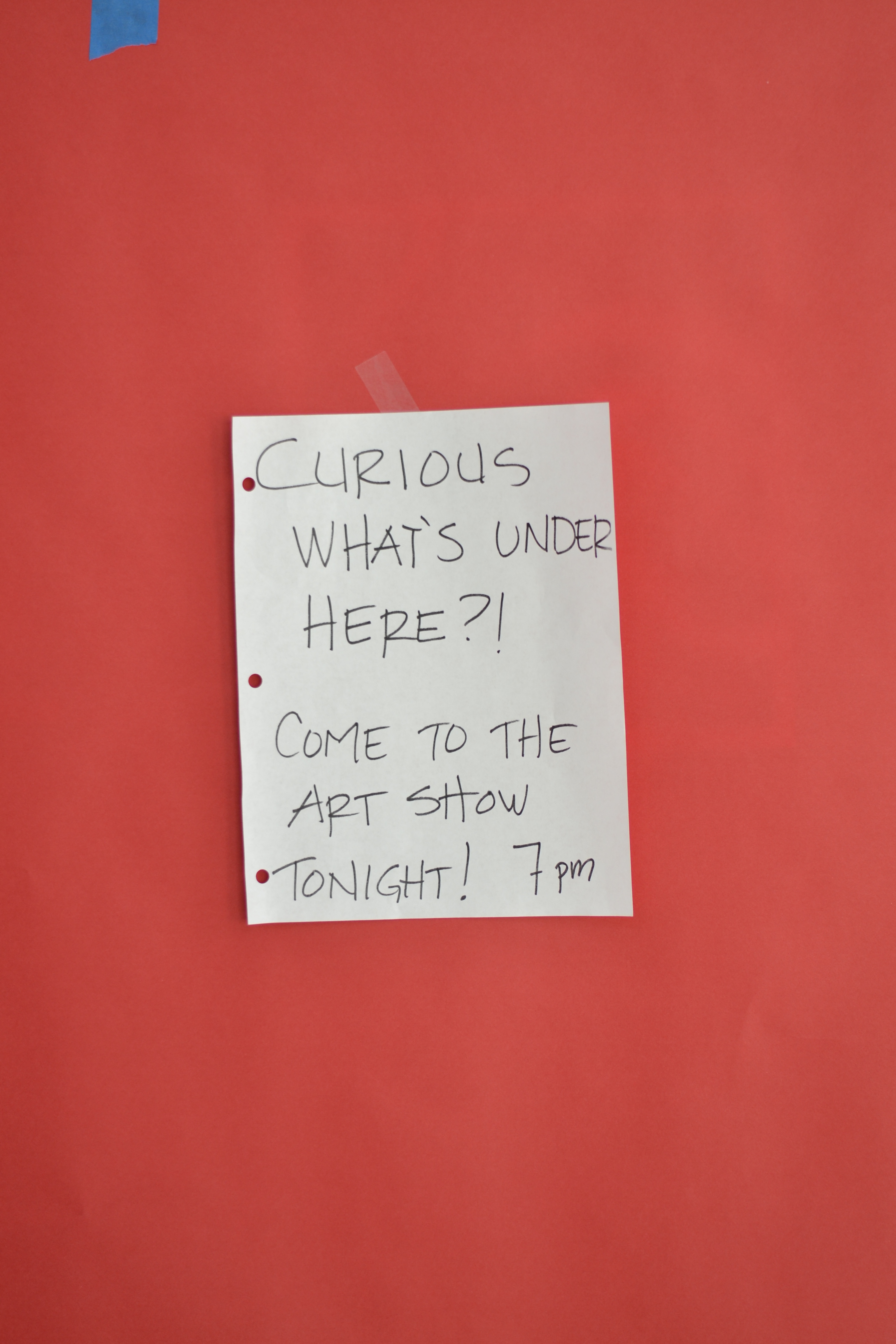 As walls became filled, we covered the work with red, green, and black paper to cover it from prying eyes. Flyers were hung, hopefully enticing students and teachers to come back tonight to fill their curiosity about what was behind the paper.