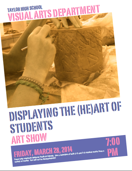 To celebrate Youth Art Month, I put on my first art show at the high school. In fact, I think it was the first show dedicated to high school art. We hadn’t had one in the time I had been there, and I didn’t know of there being one prior to my time. It was a lot more work than I had thought, but it was worth it. Work was included from almost all my students and from many of the students of the other art teacher. Formal invitations were sent to parents. The culinary students made apps for us. QR codes showcased a little bit about senior artists. And the entire first floor was full of amazing 2-D and 3-D work. It was a huge success!!